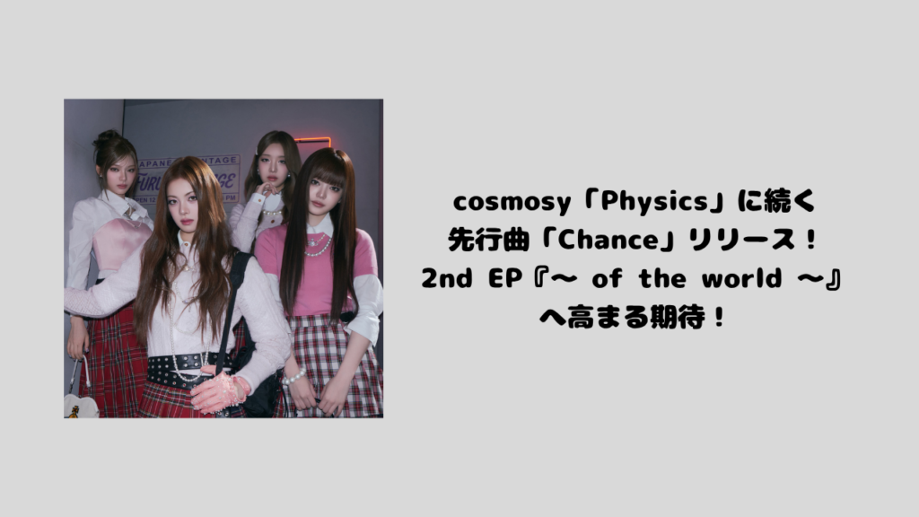 cosmosy「Physics」に続く先行曲「Chance」リリース!2nd EP『〜 of the world 〜』へ高まる期待!cosmosyは、20日午後6時より各種オンライン音楽配信サイトを通じて、2ndミニアルバム『〜 of the world 〜』の先行Digital Singl…