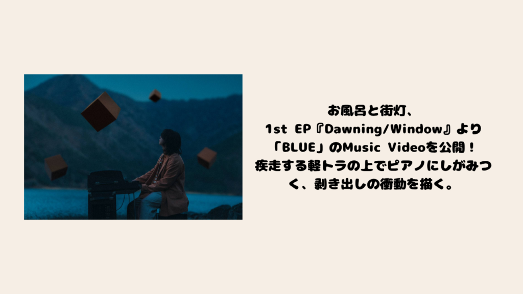お風呂と街灯、1st EP『Dawning/Window』より「BLUE」のMusic Videoを公開!疾走する軽トラの上でピアノにしがみつく、剥き出しの衝動を描く。今年1月、自身初の自主企画「歪と美学」を大盛況で終えたお風呂と街灯が自身初となるEP「Dawning/Window」より「BLUE」のMusic Videoを公…