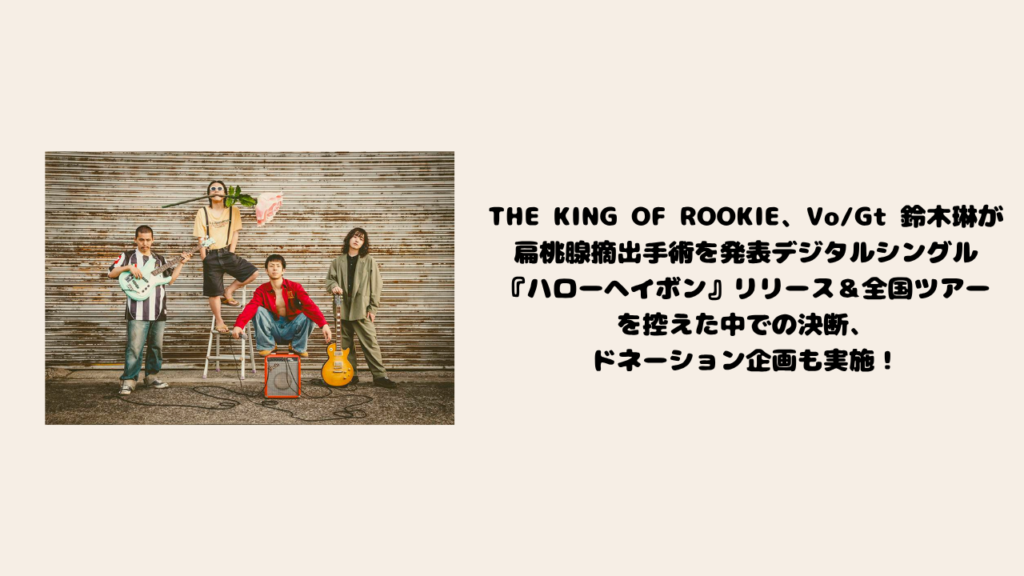 THE KING OF ROOKIE、Vo/Gt 鈴木琳が扁桃腺摘出手術を発表デジタルシングル『ハローヘイボン』リリース&全国ツアーを控えた中での決断、ドネーション企画も実施!ロックバンド・THE KING OF ROOKIEのVo/Gt 鈴木琳が、扁桃炎による炎症の再発防止を目的として、2026年4月1日より扁桃腺摘出手術を行うこと…