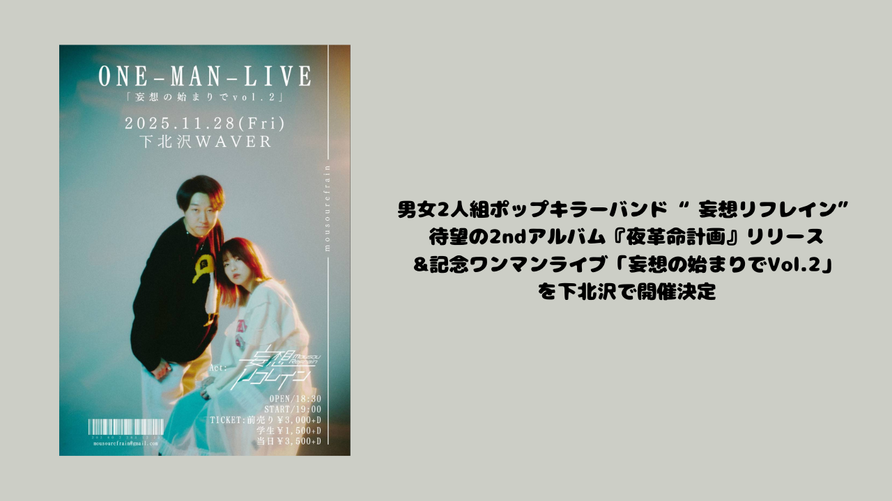 東京を拠点に活動する男女2人組ポップキラーバンド「妄想リフレイン」が、2025年11月19日(水)に2ndアルバム『夜革命計画』をリリースすることを発表した。また、これを記念したワンマンライブ「妄想の始まりでVol.2」が、2025年11月28日(金)下北沢WAVERにて開催されることも同時に発表されている。