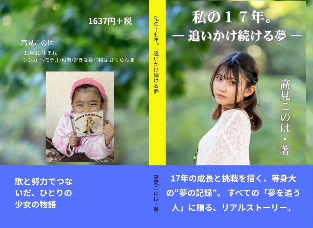 ステージのライトの下で、泣いた日も笑った日も、すべてが今につながっている。テレビ東京「The カラオケ★バトル」優勝、「美少女甲子園」グランプリの北海道が生んだ歌うま美少女女子高生シンガーソングライター“高見このは”の初自伝『私の17年。追いかけ続ける夢』の電子版がAmazonで先行発売が始まった。