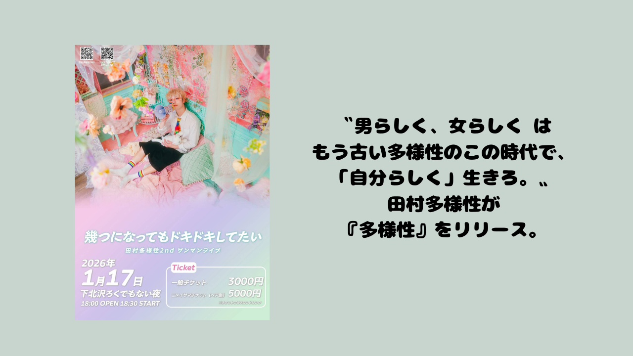 “超多様性シンガーソングライター”の田村多様性が、10/24に「多様性」をリリースした。
