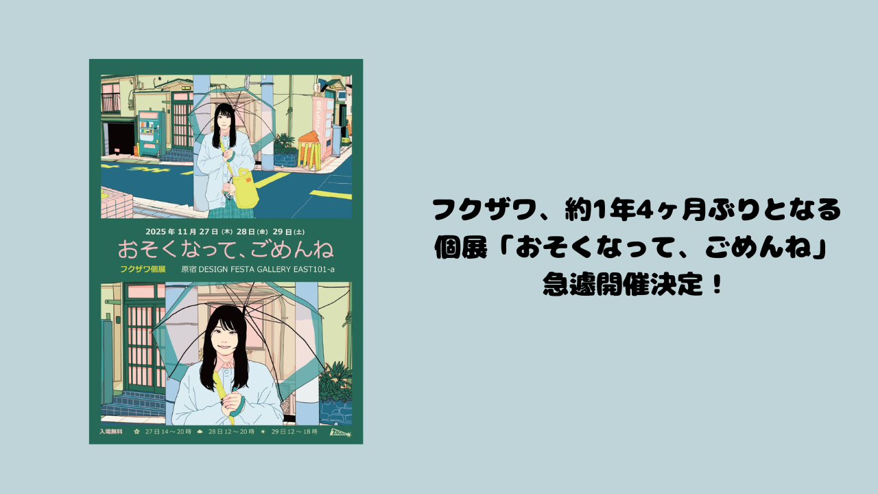 イラストレーター フクザワ は、2025年11月27日(木)〜29日(土)の3日間、東京・原宿の デザイン フェスタ ギャラリー EAST 101-a にて、個展「おそくなって、ごめんね」 を開催します。