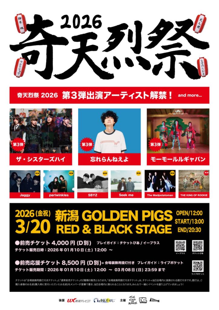 モーモールルギャバン、忘れらんねえよは、THE KING OF ROOKIEが最も尊敬するバンドであり、地元・新潟で開催される本イベントへの出演オファーが実現。また、ザ・シスターズハイは同じく新潟で結成され、これまで互いに切磋琢磨してきたバンドとして、今回の出演に至った。今後も出演アーティストは順次発表予定となっており、「奇天烈祭 2026」はさらなる盛り上がりを見せていく。
