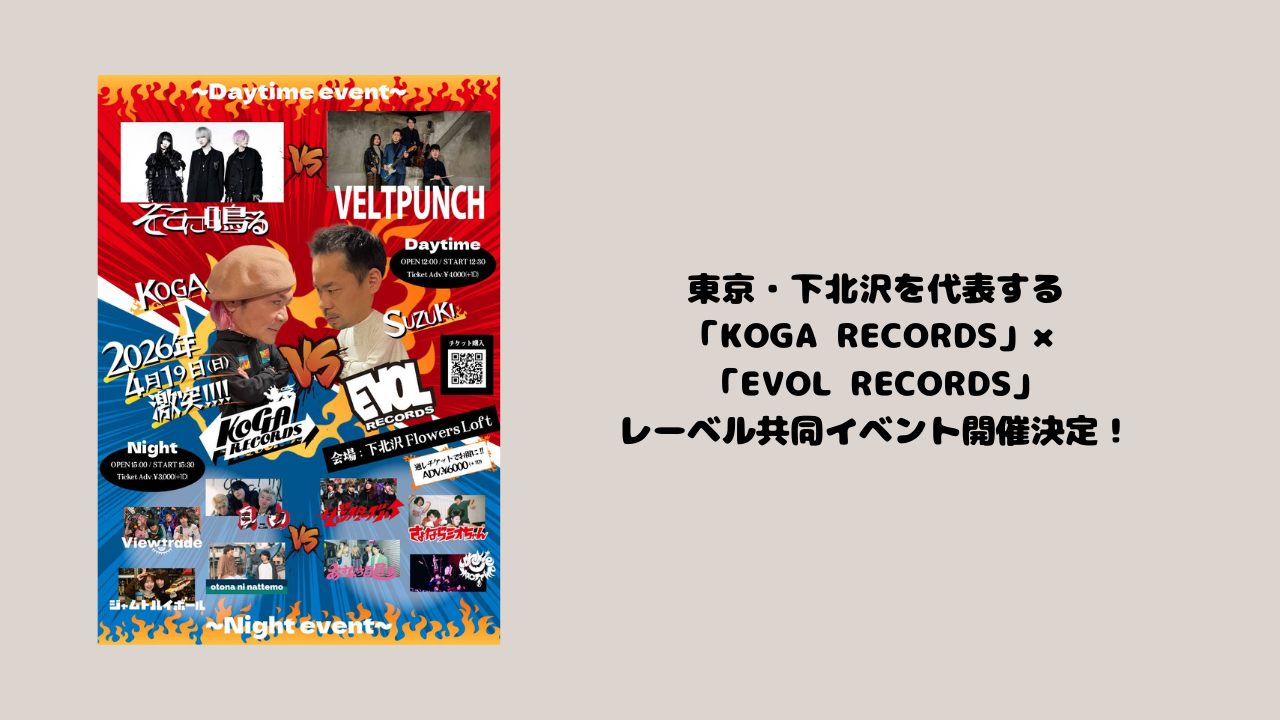東京・下北沢を拠点とするレーベル「KOGA RECORDS」 と「EVOL RECORDS」 による共同企画イベントの開催が決定した。近年では珍しくなりつつあるレーベル同士の共同イベント。「より多くの人に所属アーティストの魅力を知ってもらいたい」という両者の強い想いから、本企画は実現した。