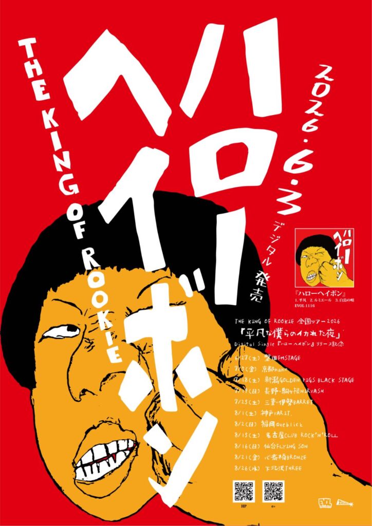 さらに、本作のリリースを記念した全国ツアー『THE KING OF ROOKIE全国ツアー2026「平凡な僕らのイカれた夜」〜Digital Single『ハローヘイボン』リリース記念〜』の開催も決定している。ツアーは6月27日(土)磐田FMSTAGE公演を皮切りに全国各地を巡り、6月27日から8月16日までの公演はザ・あどばんとのダブルレコ発スプリットツアーとして開催。8月21日(金)心斎橋BRONZE公演、8月26日(水)下北沢THREE公演(ツアーファイナル)は主催イベントとして行われる。今週4/4(土)12:00〜イープラス2次先行受付がスタートする。