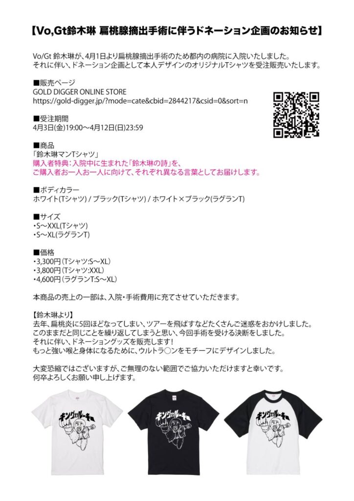 なお今回の手術発表にあわせ、ドネーション企画の実施も決定。本人デザインによるオリジナルTシャツ「鈴木琳マンTシャツ」を期間限定で受注販売し、売上の一部は入院および手術費用に充てられる。