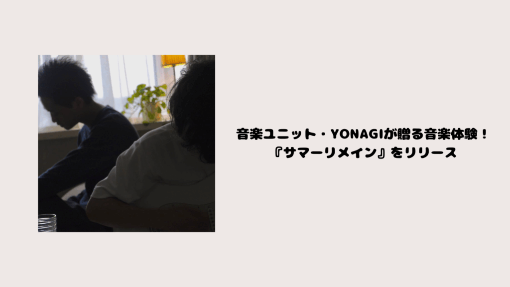 音楽ユニット・YONAGIが贈る音楽体験!『サマーリメイン』をリリース東京を拠点に活動するユニット・YONAGIが『サマーリメイン』をリリースした。 1年以上ぶりのリリースとなる本作は、夏の終わりに残る静けさや寂しさをテーマにした…