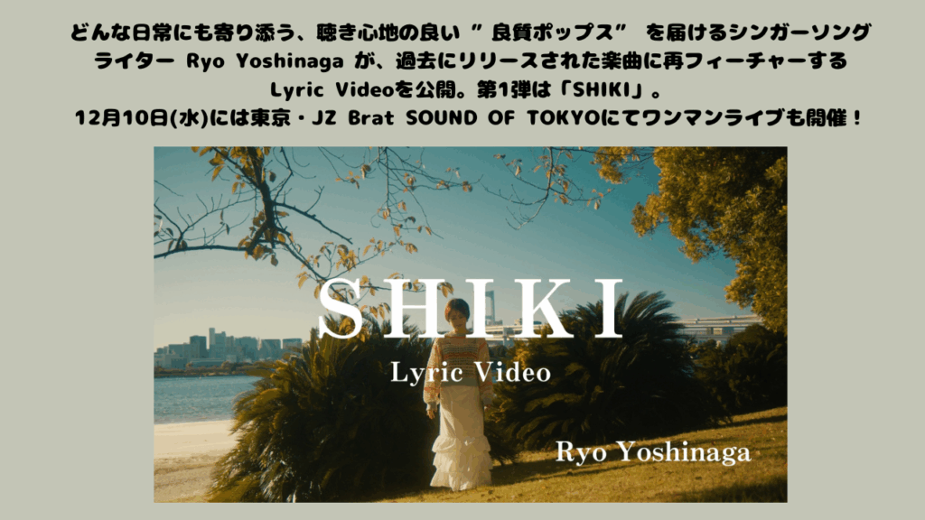どんな日常にも寄り添う、聴き心地の良い ”良質ポップス” を届けるシンガーソングライター Ryo Yoshinaga が、過去にリリースされた楽曲に再フィーチャーする Lyric Videoを公開。第1弾は「SHIKI」。12月10日(水)には東京・JZ Brat SOUND OF TOKYOにてワンマンライブも開催!シンガーソングライターRyo Yoshinagaが、国内外でもリスナーの多い楽曲を再フィーチャーしたLyric Videoを公開した。第1弾として、新たな世界観…