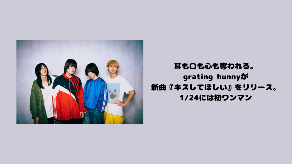 耳も口も心も奪われる。grating hunnyが新曲『キスしてほしい』をリリース。1/24には初ワンマン寝屋川発”PUNK ROCK by YOUTH”をテーマに掻き鳴らすロックバンド・grating hunnyが新曲『キスしてほしい』をリリースした。 本楽曲は銀…